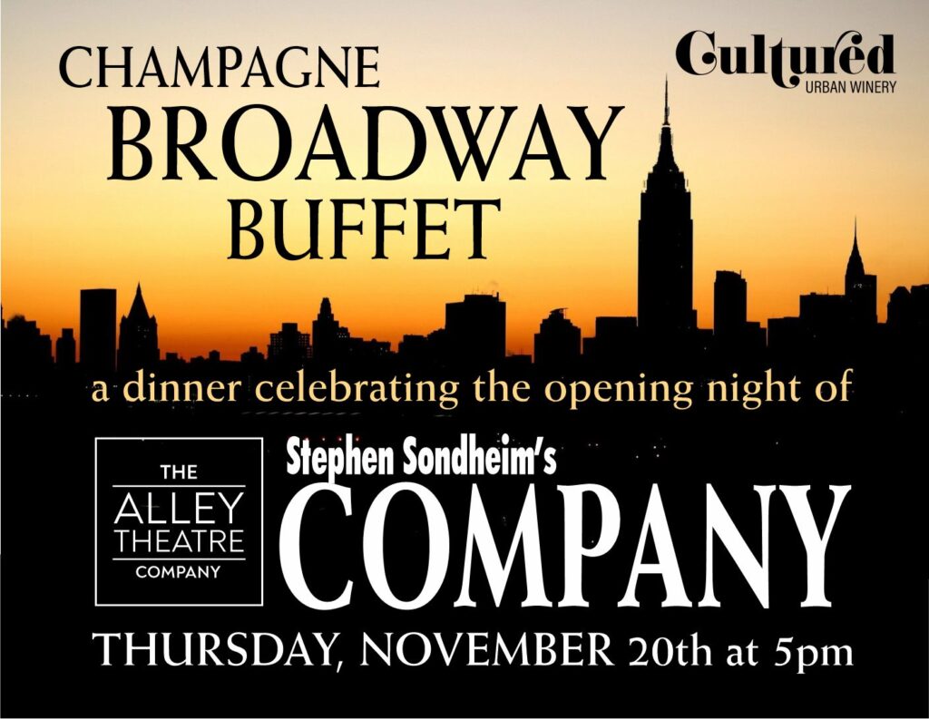 Join us for a PRE-OPENING NIGHT DINNER at Cultured Urban Winery. Your dinner ticket does not include your show tickets – “COMPANY” tickets are sold separately. Click on the graphic for tickets to the CHAMPAGNE BROADWAY DINNER at CULTURED URBAN WINERY.